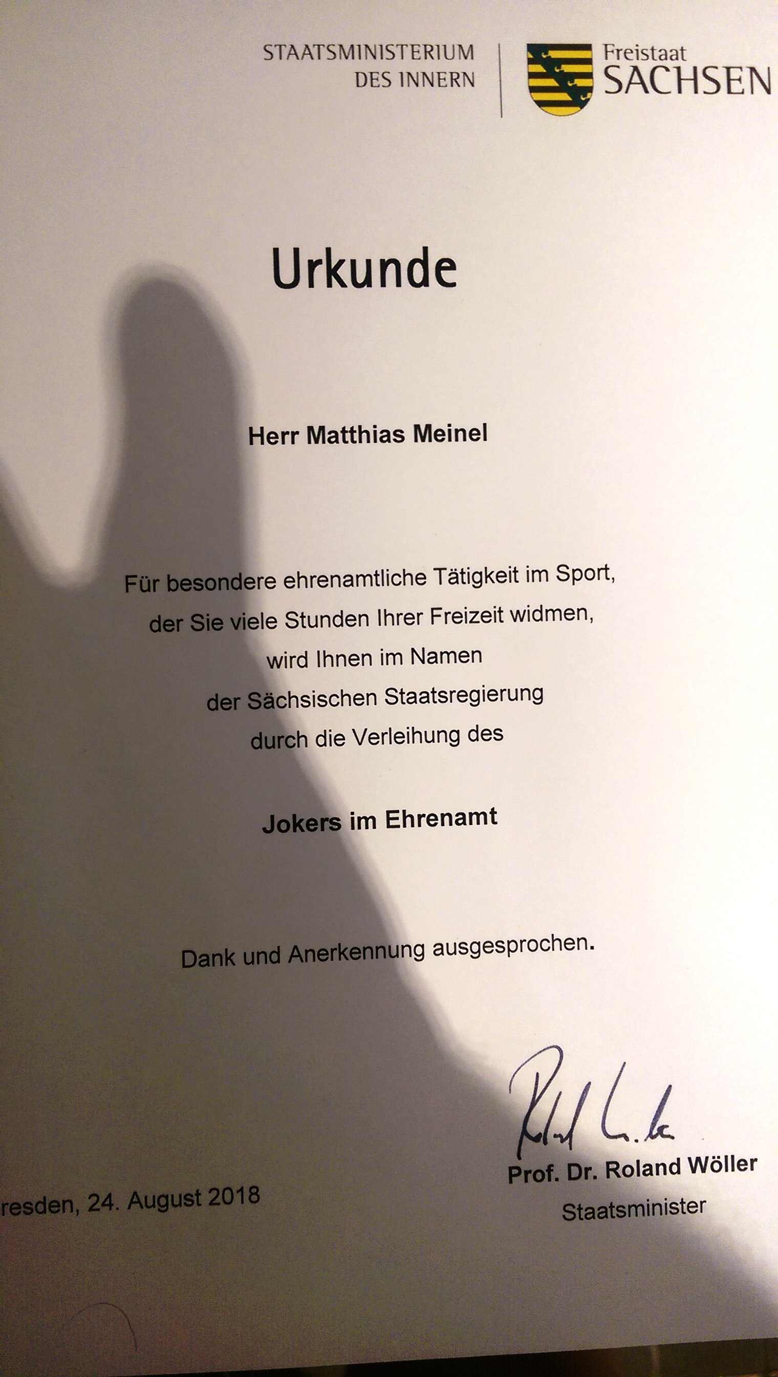 Auch aus diesen Günden wurde er von einer Kommision aus vielen Kandidaten auserwählt und erhielt von Prof. Dr. Roland Wöller, unserem Staatsminister, persönlich seine Auszeichnung.